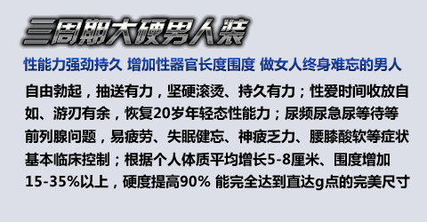 万力可治疗的范围阳痿早泄、阴茎短小、举而不坚、硬度不够、前列腺疾病、做爱时间短想更持久的男士;性功能障碍、性功能减退、性功能不敏感、阴囊潮湿、遗精少精、中途疲软、房事后疲劳、腰膝酸软的男士;万力可是美国华纳制药公司出品,美国进口,采用的原料是法国布列塔海岸的深海生蚝中提取;